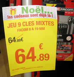 Juste avant la période des soldes et ses moins 20, moins 30, moins 50 ou moins 70%, le magasin Leroy-Merlin de Douai a inventé la promotion 0% comme le montre l’image prise le 29 décembre 2011. A droite, juste après l’entrée des clients, un îlot était consacré aux outils Facom, la rolls des bricoleurs avec des promotions très symboliques jusqu’à trouver cette magnifique pancarte :